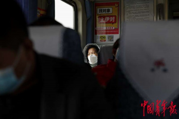 2月10日,T145次列车上,一名乘客望着窗外。中青报·中青网记者 陈剑/摄