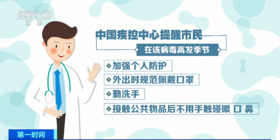 中国疾控中心提醒市民,在该病毒高发季节,要加强个人防护,外出时规范佩戴口罩,勤洗手,接触公共物品后不用手触碰眼、口、鼻。