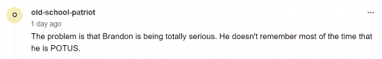 在福克斯评论区,也有人留言说,“问题是‘布兰登’是认真的。大多数时候他都不记得自己是美国总统。”该网友提到的“布兰登是”2021年全美各地频繁出现一个抗议拜登政府的口号:“加油布兰登!(Let’s go Brandon)。据美媒报道,这一口号蕴含之意“十分粗俗”。