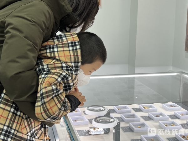 上午,《时光胶囊——琥珀与时光的故事》琥珀特展吸引了不少观众前来观展。大家俯下身,透过玻璃展台,仔细观察一枚枚精美的琥珀化石。几千万到数亿年前的蜘蛛、蚊子、蚂蚁甲虫,以及植物的叶片,被封印在小小的琥珀中。在几块大量昆虫聚集的距今一亿年前的琥珀化石前,市民丁笑瑜停下了脚步。她一边和孩子讲述琥珀的形成,一边拿出手机拍照。“之前都是在书本上学习的,这次一起到现场看琥珀,非常震撼!”