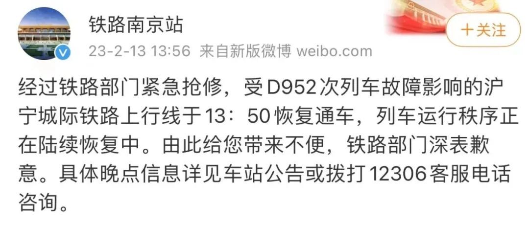 荔枝新闻讯 据@铁路南京站 微博消息:2023年2月13日10时许,D952次列车运行至沪宁城际线宝华山至仙林站间突发故障,影响沪宁城际上行部分列车不同程度晚点,铁路部门第一时间启动应急预案,组织人员抢修设备,由此给旅客出行带来不便,铁路部门深表歉意。相关列车的晚点情况,请留意车站公告或致电12306客服热线查询。