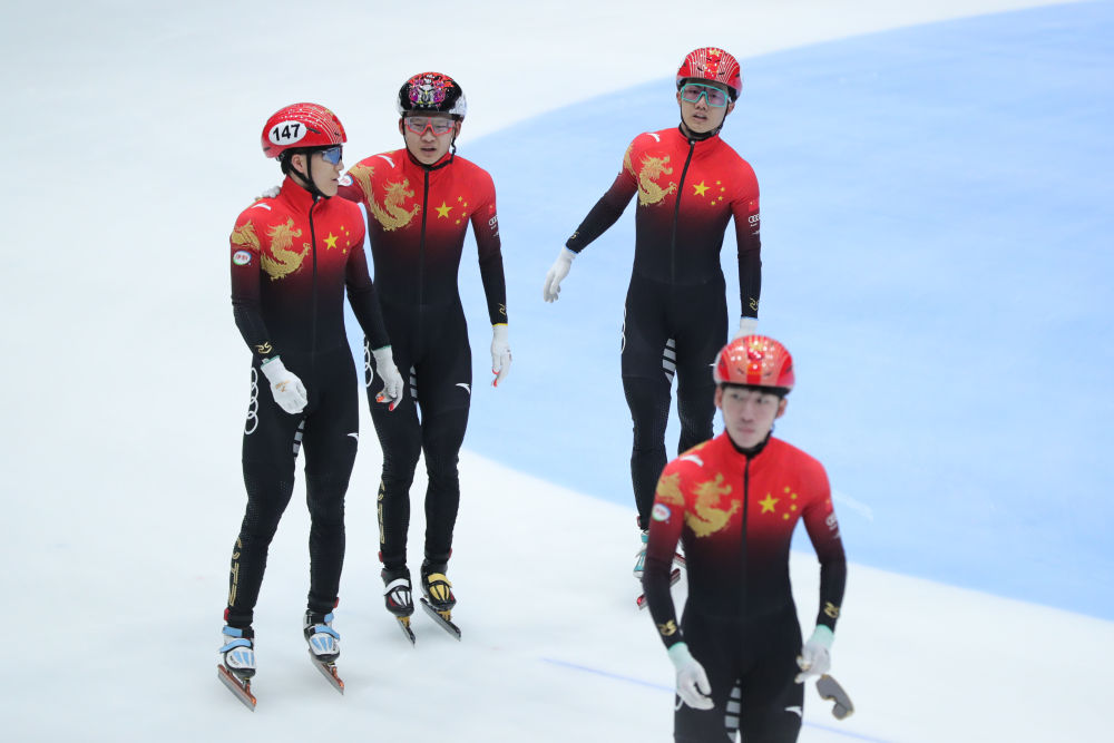 2月12日,中国队选手宋嘉华、钟宇晨、李文龙和林孝埈(从左至右)在男子5000米接力决赛后。新华社记者 郑焕松 摄