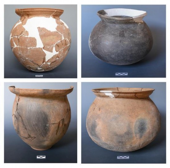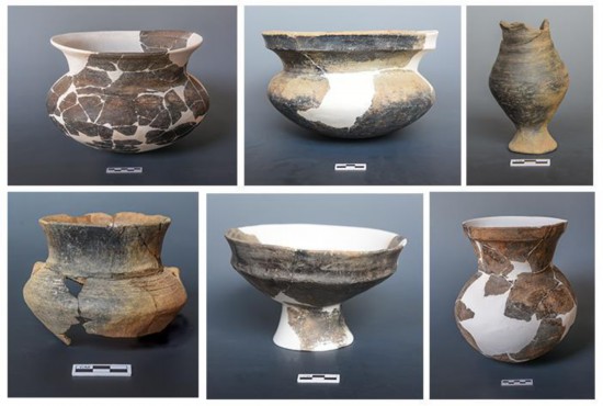 古城村遗址面积约4.2万平方米,现存的贝丘堆积最厚处达6.5米,由大量尾部被敲破的螺蛳壳与灰土层交替堆叠形成。碳十四测定年代为距今3600至2500年,约相当于中原地区的商代至两周时期。商代遗存可分为早晚两段,早段发现保存完整的椭圆形环壕聚落,由中心台地、外围环壕和护坡组成,中心台地面积约27000平方米,环壕和护坡周长约600米,这种聚落格局一直延续至两周时期。商代晚段发现一批土坑墓和瓮棺葬。两周时期的遗存以房址、螺壳堆、灰烬、活动面等居住类遗迹为主,房址多为方形半地穴式。出土青铜器、陶器、玉器、石器、骨器、木器等文物4000余件。