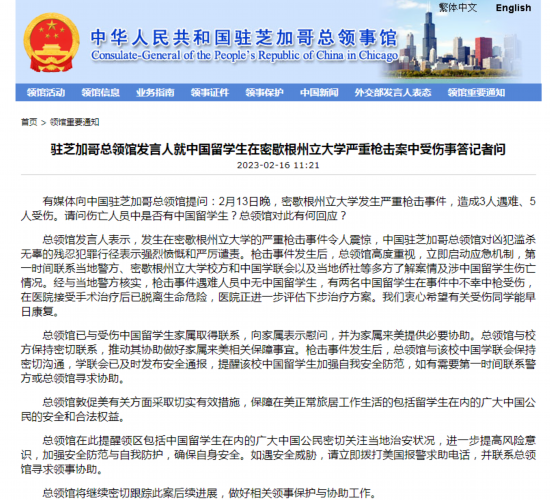 有媒体向中国驻芝加哥总领馆提问:2月13日晚,密歇根州立大学发生严重枪击事件,造成3人遇难、5人受伤。请问伤亡人员中是否有中国留学生?总领馆对此有何回应?