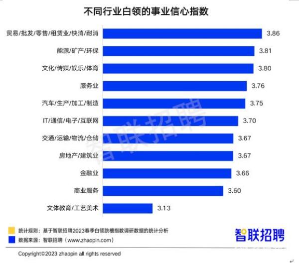 分行业看,对于2023年事业发展最有信心的是贸易/批发/零售/租赁业/快速消费品/耐用消费品行业,以3.86的指数领跑,高于2022年的3.66,排名也从去年的第二位提升至第一。随着刺激消费举措的陆续出台,零售快消行业迎来发展之春,该行业白领对2023年具有向好的预期。能源/矿产/环保行业以3.81的事业信心指数排名第二,比去年3.75的事业信心指数有所提高。在双碳目标指引下,传统能源企业在向绿色低碳转型,新能源行业更是蓬勃发展,从业者对未来满怀信心。