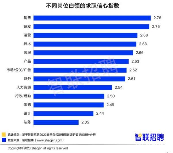 数据显示,销售岗位认为跳槽很容易和比较容易的占比共24.8%,销售岗位白领的求职信心指数为2.76,排名各岗位第一。目前各行各业在“抢单”促发展,这让销售岗位有了更好的发展机会,白领求职信心增强。此外,研发和技术的求职信心指数连续两年排在前五,岗位技术含量高、竞争壁垒高的白领对跳槽更有信心。