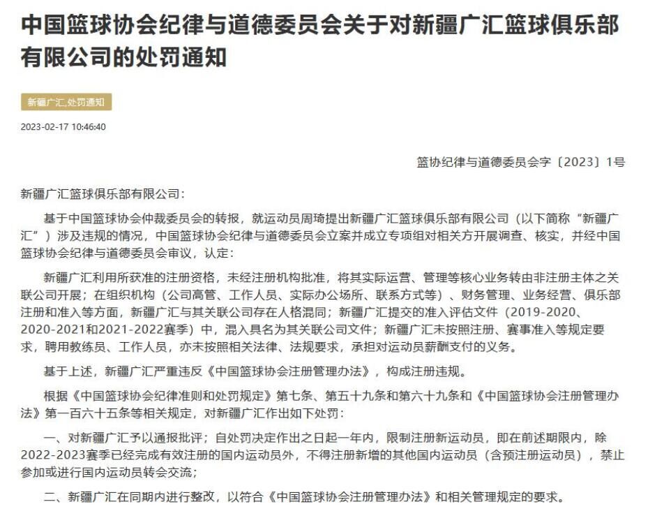 荔枝新闻讯 就运动员周琦提出新疆广汇篮球俱乐部有限公司(以下简称“新疆广汇”)涉及违规的情况,中国篮协17日发布公告称,中国篮球协会纪律与道德委员会立案并成立专项组对相关方开展调查、核实,并经中国篮球协会纪律与道德委员会审议,认定新疆广汇严重违反《中国篮球协会注册管理办法》,构成注册违规,因此作出如下处罚: