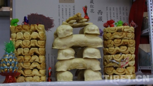 图为年货市场里摆放的“德嘎”样式(是由形状不同的油炸面食垒起来的供品) 摄影:次旦拉姆