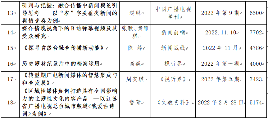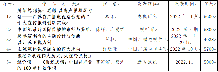 江苏省广播电视总台拟推荐《用新思想统一思想 以高声量凝聚力量--江苏省广播电视总台党的二十大宣传报道创新实践》等18件作品参加“2022年度江苏省好新闻(新闻业务研究)”评选活动,现予以公示。公示期为2023年2月17日至2023年2月23日,在此期间,社会各界可通过电话、传真或电子邮件等方式发表评议意见,逾期不再受理。