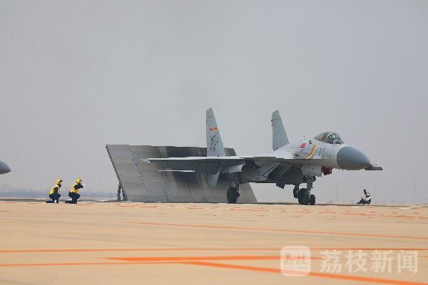 飞行员示意做好起飞准备。身穿“黄色马甲”的起飞助理迅速下蹲,右手握拳,中指和食指向起飞方向凌空一指,“飞鲨”战机如离弦之箭,滑出陆基甲板,模拟舰上起飞。