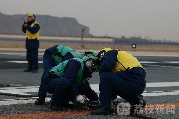 演练中,导调组还在难局、危局、险局中检验官兵应急保障能力。接到应急更换阻拦索指令后,身着“绿色”甲板识别服的保障官兵迅即出动,拉索、卸索、换索、对接……随后,阻拦索安全观察员向甲板指挥员给出复位手势,示意阻拦索更换完毕。