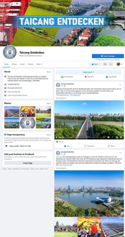 去年,我市上线了“Discover Taicang”海外社交媒体矩阵,特别开设了“发现太仓”德文脸谱(Facebook)专页,使太仓成为全国首个拥有德文社交媒体的县级市。海媒平台全方位、全景式聚焦在太德企发展亮点、太仓对外合作资讯等内容,向世界展现太仓开放包容的现代化国际城市形象。截至目前,海媒平台共计发布帖文650余条,总阅读量超过960万人次,互动量超过80.04万次。
