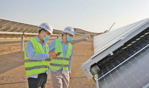 中企工作人员正在沙特红海新城项目的光伏电站现场测试自动清扫机器人。本报记者 管克江摄