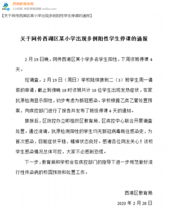 荔枝新闻讯 2月19日晚,网传杭州某小学多名学生阳性,下周该班停课4天。今天上午,杭州市西湖区教育局通过“西湖教育官微”发布通报。