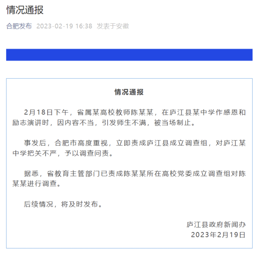 据“合肥发布”消息,庐江县政府新闻办19日通报:2月18日下午,省属某高校教师陈某某,在庐江县某中学作感恩和励志演讲时,因内容不当,引发师生不满,被当场制止。
