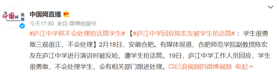 19日,庐江中学工作人员回应,学生很勇敢,不会处理学生,会有相关部门跟进处理。
