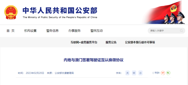 今天(2月20日),公安部交通管理局发布消息:公安部与澳门特别行政区政府签署内地与澳门驾驶证互认换领协议,协议将自2023年5月16日起生效。