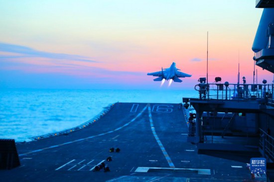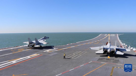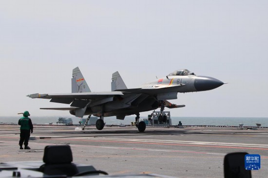 海军航空大学某基地飞行员驾驶歼-15战机进行触舰复飞(2021年10月20日摄)。新华社发(姜涛 摄)