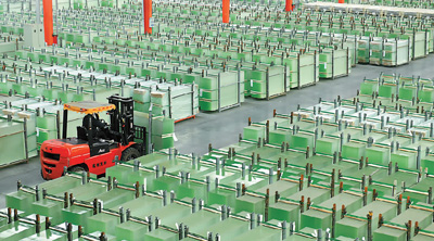 2月15日,安徽燕龙基新能源科技有限公司生产车间内,工人利用叉车搬运光伏压延玻璃产品,准备装车外销。