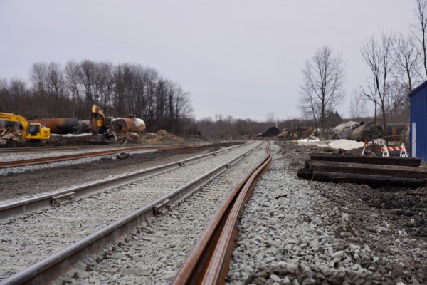 这是2月14日在美国俄亥俄州东巴勒斯坦镇列车脱轨事故现场附近拍摄的铁轨。新华社发(章焱飞摄)