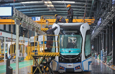 在位于四川省宜宾市三江新区的中车铁投轨道交通产业基地生产车间,工人生产安装智轨电车。去年以来,由中国中车生产制造的智轨电车先后出口运往阿联酋和马来西亚,中国高端装备制造成功出海。