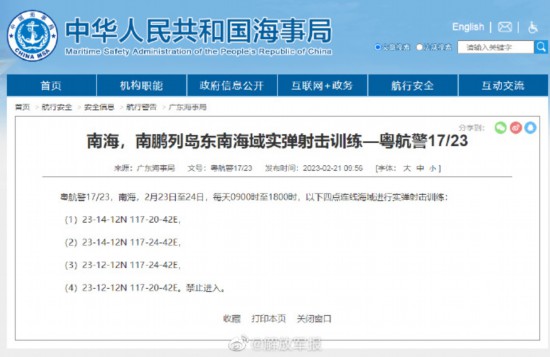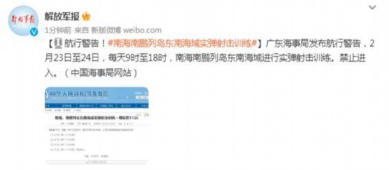 广东海事局发布航行警告,2月23日至24日,每天9时至18时,南海南鹏列岛东南海域进行实弹射击训练。禁止进入。