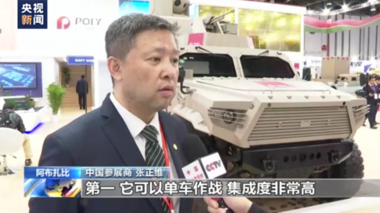 中国参展商 张正维:第一,它可以单车作战,集成度非常高,我们把相关的雷达、光电探测等等以往要分布在其他车辆上面的探测设备集成到了一台车上。第二,它是一种低功率的激光武器,相比于其他的我们以往的型号来说,它可能更适合于一些重要人物的安保,一些建筑物的周边进行随行的安防保护。第三,也是它比较大的一个特点,它可以进行行进间的发射,这款装备可以在一定速度的情况下同时实现行进间发射,这也是一个创新。