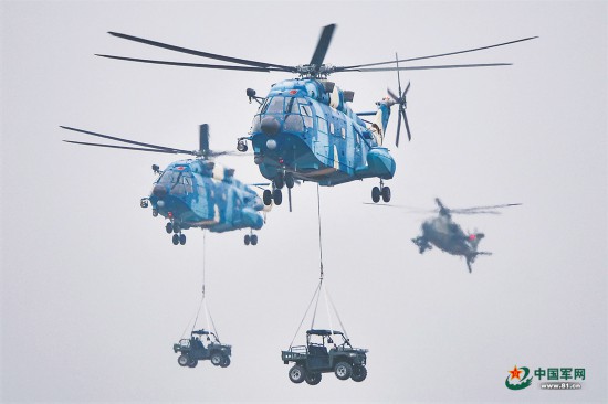 “起飞!”接到塔台指令后,搭载人员、装备的各型直升机陆续升空,按照功能化编组向目标空域飞去。