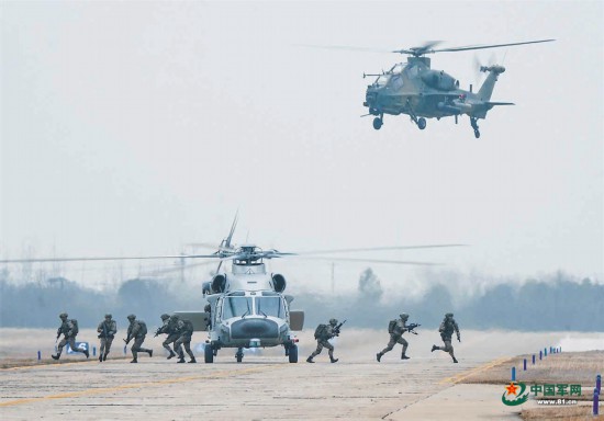 突击队员在武装直升机掩护下进入“战场”。
