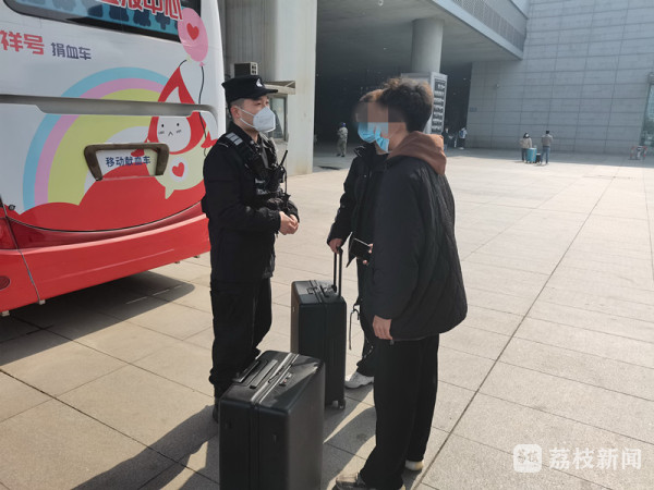 2月19日上午9点多,南京特警支队武装巡逻一大队民警郭阳在值守南京南站快反点时,一位神色匆匆的小伙拉着行李箱跑来向民警求助。