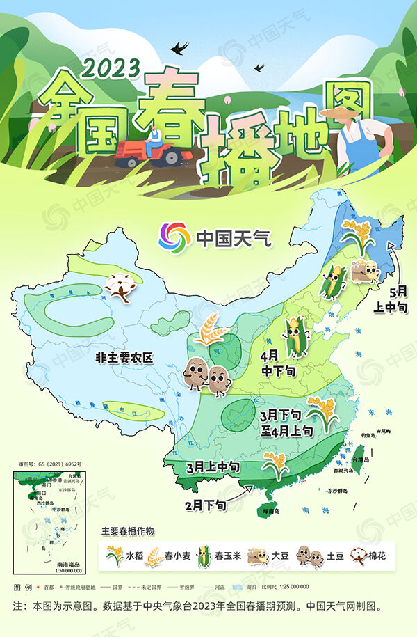 根据中国天气网发布的2023全国春播地图可以看出,今年我国春播在2月下旬陆续开始,由南至北持续至5月上中旬。