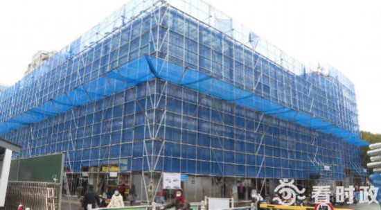 记者了解到,东环路苏安商业中心的周边都已经搭上脚手架 ,工人正在进行整修工作,这标志着姑苏区东环高架沿线公共空间立面环境提升工程已全面开工。