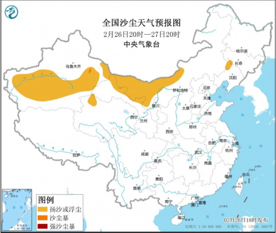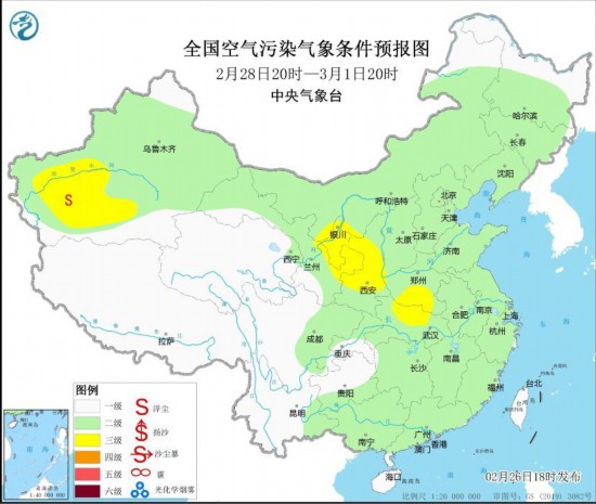 2月26日夜间至27日,华北中部、汾渭平原等地大气扩散条件较差,部分地区有轻至中度霾。2月28日开始受冷空气影响,上述地区霾天气自北向南逐渐减弱。此外,2月27日,新疆东部和南部、内蒙古西部、甘肃河西、宁夏等地的部分地区有扬沙或浮尘天气,新疆东部局地有沙尘暴。