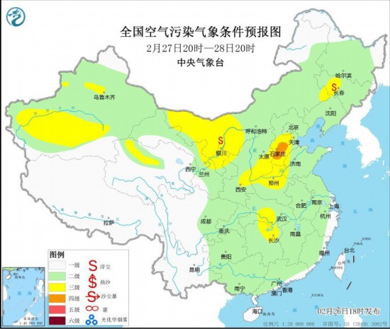 2月26日夜间至27日,区域大气扩散条件较差,有轻至中度霾。