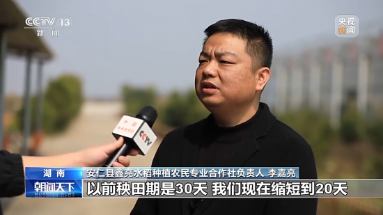 湖南省安仁县鑫亮水稻种植农民专业合作社负责人 李嘉亮:以前秧田期是30天,我们现在缩短到20天,可以为周边的农户提供2.5万亩到3万亩的秧苗。