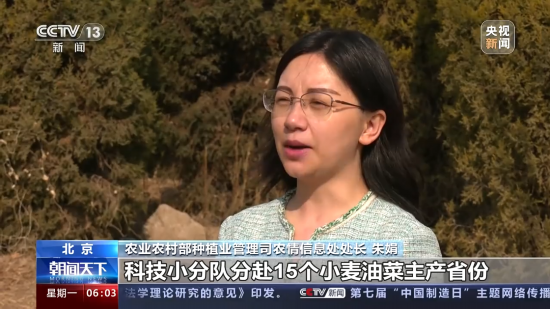 农业农村部种植业管理司农情信息处处长 朱娟:科技小分队分赴15个小麦油菜主产省份,包片蹲点,指导落实以“控旺促弱、抗旱防冻、防病治虫”为重点的春季田管关键措施,全力以赴打赢夏粮丰收第一仗。