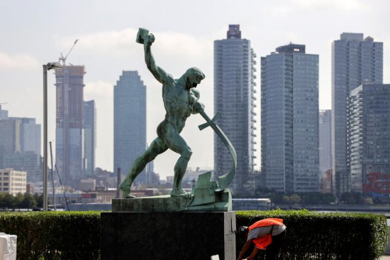 这是2019年9月11日在位于纽约的联合国总部拍摄的雕塑“铸剑为犁”。新华社记者 李木子 摄