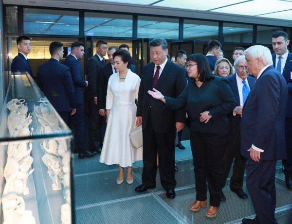 2019年11月12日,国家主席习近平和夫人彭丽媛在时任希腊总统帕夫洛普洛斯夫妇陪同下,参观雅典卫城博物馆。
