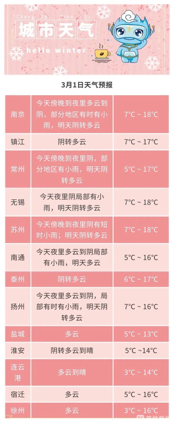 2月28日20时至3月01日20时,本省苏南南部地区阴有小雨,其他地区阴转多云。最高温度:苏南地区18℃左右,本省东北部地区12~13℃,其他地区15~16℃;最低温度:沿江和苏南地区5~6℃,淮北地区2~3℃,其他地区4℃左右。