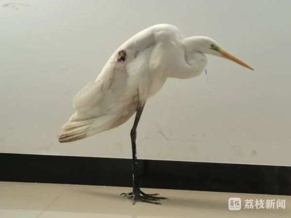 野生动物救助中心工作人员检查后发现,这只白鹭翅膀受伤,不能正常飞行,工作人员表示会待其翅膀伤愈后再放飞大自然。