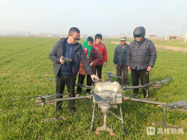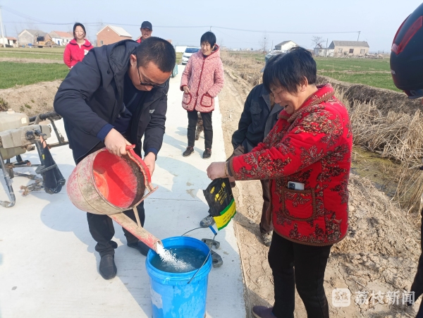 2月28日下午,记者走进射阳县临海镇二垛社区九组小麦田头,村民臧必亮正在忙着配比农药和无人机起飞前的准备工作。