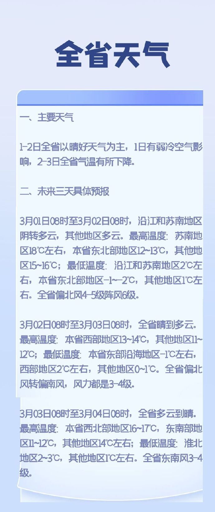3月01日08时至3月02日08时,沿江和苏南地区阴转多云,其他地区多云。最高温度:苏南地区18℃左右,本省东北部地区12~13℃,其他地区15~16℃;最低温度:沿江和苏南地区2℃左右,本省东北部地区-1~-2℃,其他地区1℃左右。全省偏北风4-5级阵风6级。