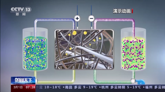 电池研发部技术总监 李京浩:这个就是一个小的电池,通过把电解液打到电池里面,在这里面可以进行充放电的电化学反应。电解液可以通过泵输送到电池里,然后再出来回到储罐,它的储罐里就是存储的电解液,电能就储存在液体里面。当我们做到大型化的时候,其实主要部件都是一样的,然后就可以进行大功率的充放电了。