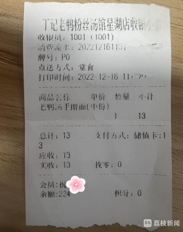就在民警“山重水复疑无路”时,发现手机壳内夹杂着一些纸张:有纸币70元、一张粮票和一张2022年12月在某老鸭粉丝汤馆吃饭的消费小票。小票的会员名标注祝某。民警通过该姓名,查询到手机号码,并成功联系上祝某。
