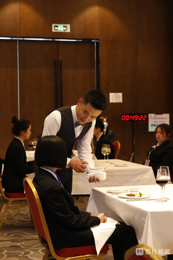 眼下,2023年江苏省职业院校技能大赛正在火热进行中,继中职组比赛全部结束后,高职组赛事全面展开。今天(3月2日),由南京工业职业技术大学承办的高职旅游类“餐厅服务”项目比赛举行。今年该项目新增“服务方案设计”环节,注重考核选手专业积累、技能实战等综合素养。