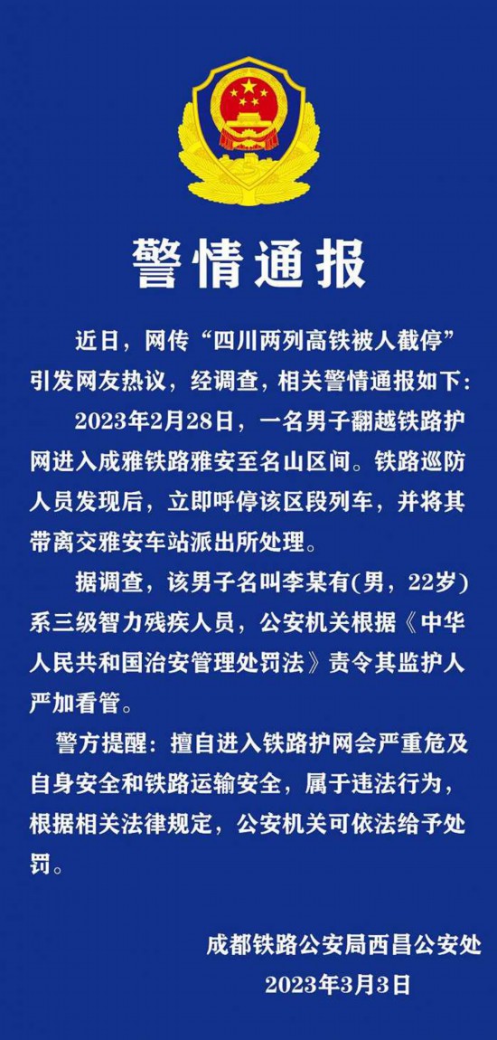 荔枝新闻讯 据西昌铁警在线官微通报,经查,2月28日,一名男子翻越铁路护网进入成雅铁路雅安至名山区间。铁路巡防人员发现后,立即呼停该区段列车,并将其带离交雅安车站派出所处理。