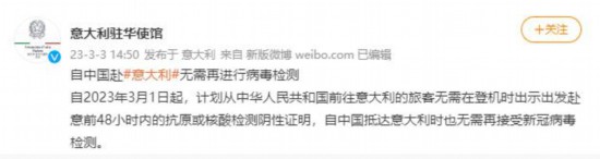 3月3日,据@意大利驻华使馆 微博消息,自2023年3月1日起,计划从中华人民共和国前往意大利的旅客无需在登机时出示出发赴意前48小时内的抗原或核酸检测阴性证明,自中国抵达意大利时也无需再接受新冠病毒检测。