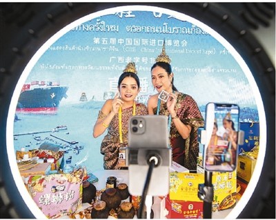 在第五届中国国际进口博览会广西老字号非遗馆,身穿民族服装的工作人员直播推荐当地非遗工艺品。