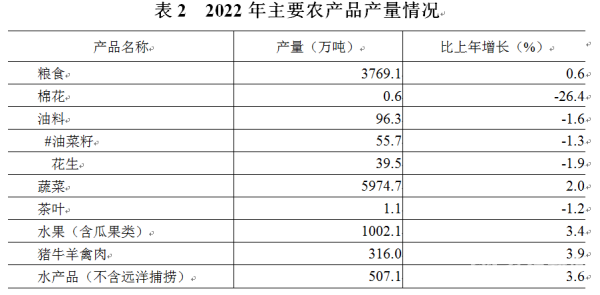 粮食生产形势持续向好。全年粮食总产量3769.1万吨,比上年增产0.6%。其中,夏粮产量1400.3万吨,增产1.4%;秋粮产量2368.8万吨,增产0.1%;粮食单产6922.9公斤/公顷,总产单产均创历史新高。全年粮食播种面积544.4万公顷,比上年增加1.7万公顷;棉花种植面积0.4万公顷,减少0.2万公顷;油料种植面积28.9万公顷,减少0.8万公顷;蔬菜种植面积147.1万公顷,增加1.8万公顷。