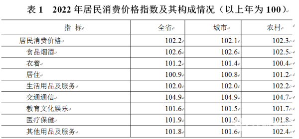 居民消费价格温和上涨。全年居民消费价格比上年上涨2.2%。分城乡看,城市上涨2.1%,农村上涨2.3%。分类别看,食品烟酒价格上涨2.6%,衣着价格上涨1.2%,居住价格上涨0.9%,生活用品及服务价格上涨2.0%,交通通信价格上涨4.9%,教育文化娱乐价格上涨1.6%,医疗保健价格上涨1.9%,其他用品及服务价格上涨1.8%。食品中,粮食、鲜菜、鲜果价格分别上涨2.8%、3.0%、12.3%,猪肉价格下降6.9%。